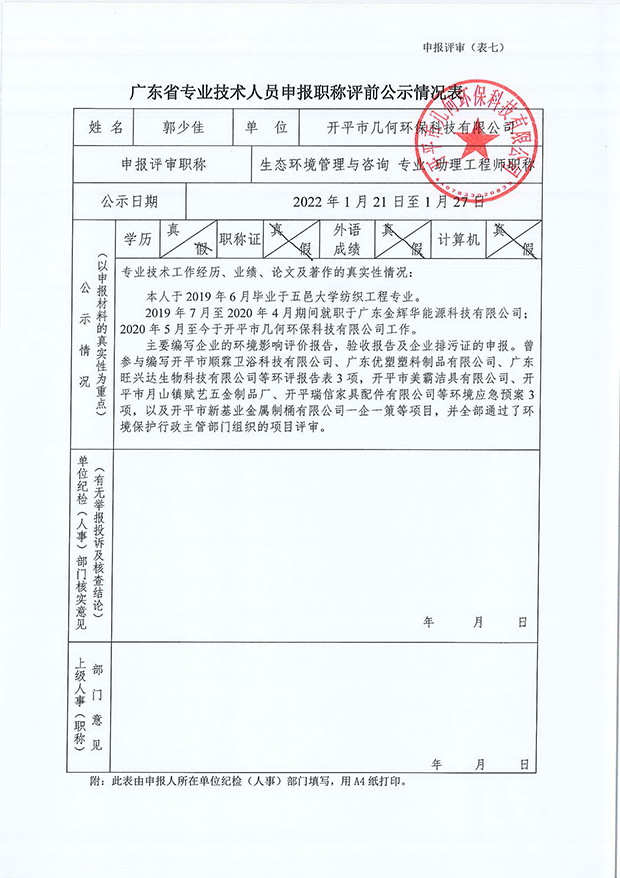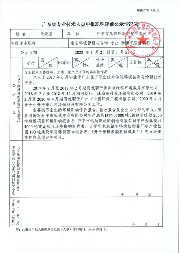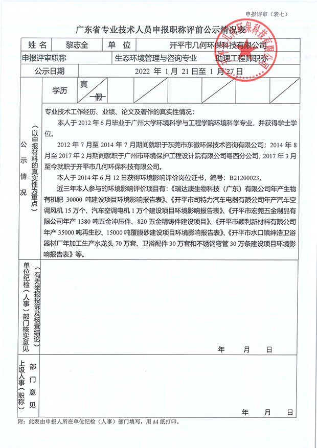 開(kāi)平市幾何環(huán)??萍加邢薰炯夹g(shù)人員申報(bào)職稱評(píng)前公示