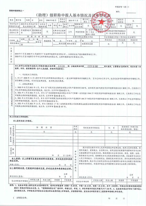 經(jīng)個(gè)人申報(bào)和單位初步審核,我公司黎志全、徐紫瑩、郭少佳申報(bào)相應(yīng)職稱。現(xiàn)對(duì)其申報(bào)相應(yīng)職稱材料進(jìn)行公示。
